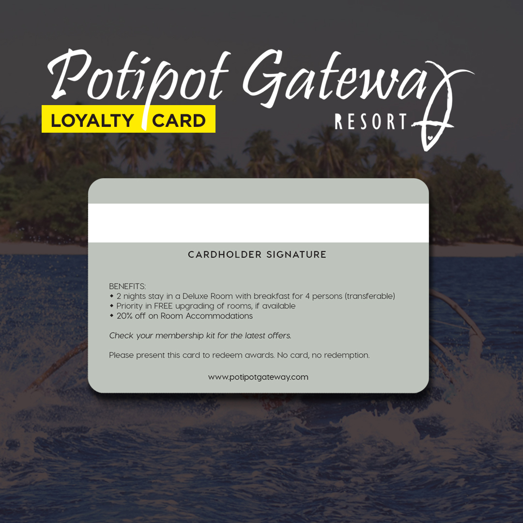 The Potipot Gateway Resort Loyalty Card is a property of Potipot Gateway Resort. The card must be signed by the member. The privileges of membership will only be granted on presentation of a valid membership card with a valid membership number.
